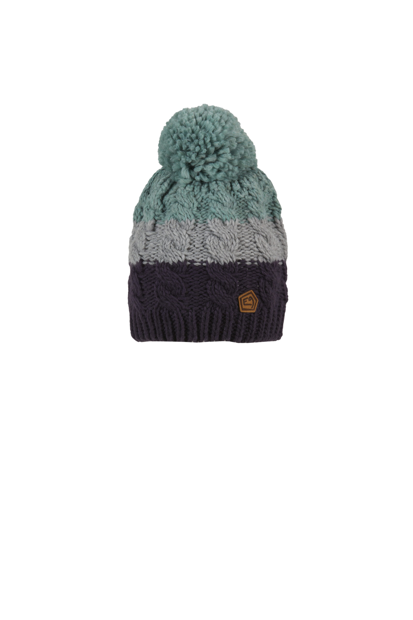 Berretto lavorato a maglia con pompon, tre grandi strisce in tre colori diversi. Toppa sul lato sinistro. Prodotto in Italia.