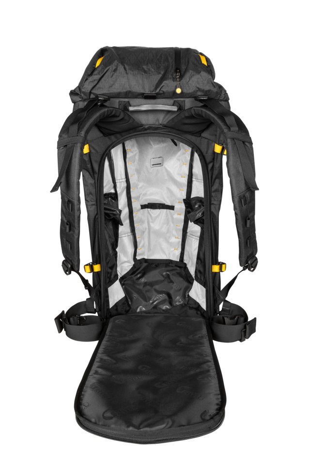 Fettucce, lacci, porta piccozza, cinghie e cintura ventrale a scomparsa. Ampia e veloce apertura superiore per ottenere una perfetta funzionalità. Apertura a zip sulla schiena per facilità di accesso in ogni situazione.