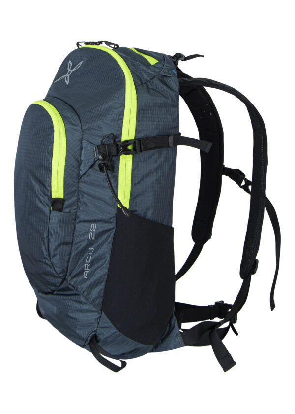 Zaino 22L, tessuto nylon 6 ROBIC® DWR con costruzione triple-ripstop, due tasche laterali in rete, tasca sopra con zip, tasca compatibile con sistemi di idratazione, ampia tasca frontale con zip, doppio laccio per piccozze e bastoncini, fibbie di chiusura.